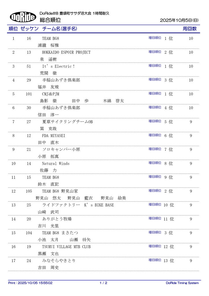 【総合順位】豊頃町ササダ沼大会 1時間耐久 2025年10月05日 ※PDFはこちらからダウンロードしてください。 (要解凍・配布用プログラム、カテゴリー別順位全部入り)https://doride-result.blog.jp/251005_sasada_result.zip 「クロスカントリー」カテゴリの最新記事 < 前の記事次の記事 >